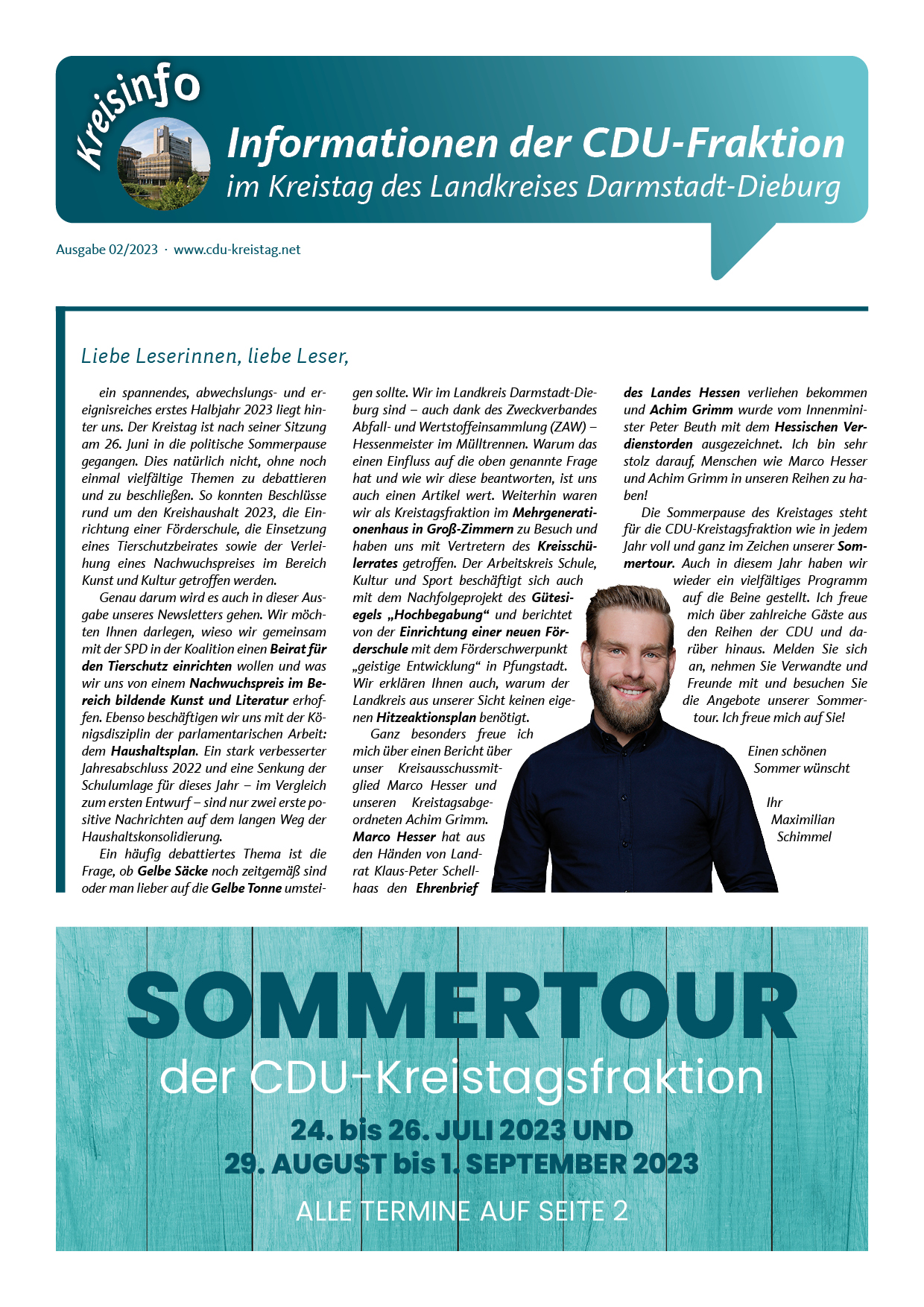 Ein häufig debattiertes Thema ist die Frage, ob Gelbe Säcke noch zeitgemäß sind oder man lieber auf die Gelbe Tonne umsteigen sollte. Wir im Landkreis Darmstadt-Dieburg sind – auch dank des Zweckverbandes Abfall- und Wertstoffeinsammlung (ZAW) – Hessenmeister im Mülltrennen. Warum das einen Einfluss auf die oben genannte Frage hat und wie wir diese beantworten, ist uns auch einen Artikel wert. Weiterhin waren wir als Kreistagsfraktion im Mehrgenerationenhaus in Groß-Zimmern zu Besuch und haben uns mit Vertretern des Kreisschülerrates getroffen. Der Arbeitskreis Schule, Kultur und Sport beschäftigt sich auch mit dem Nachfolgeprojekt des Gütesiegels „Hochbegabung“ und berichtet von der Einrichtung einer neuen Förderschule mit dem Förderschwerpunkt „geistige Entwicklung“ in Pfungstadt. Wir erklären Ihnen auch, warum der Landkreis aus unserer Sicht keinen eigenen Hitzeaktionsplan benötigt.